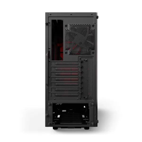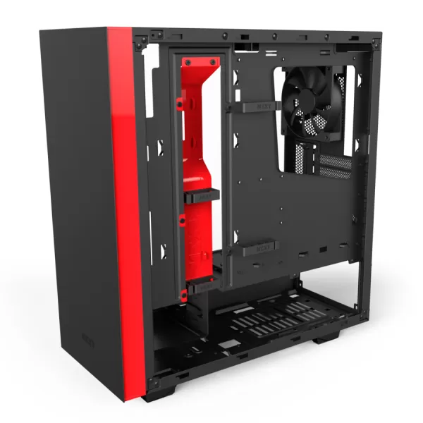 NZXT S340 Elite Matte Black/Red, SECC Steel ATX Mid Tower, fara sursa (tip ATX, montata jos), interior vopsit negru cu accente rosii, 2+1x3.5” (intern), 3+1x2.5” (intern), design tool-less, fata – 2x 140/120mm fans (optional), spate – 1x 120mm FN V2 fan (inclus), tavan – 1x 120mm FN V2 fan (inclus) sau 1x 140mm fan (optional), design premium cu panou lateral din sticla securizata, include un puc magnetic ce poate fi folosit ca stand pentru casca VR/casti audio sau pentru wire management, 2x USB 3.0, 2x USB 2.0, 1x Audio/Mic, 1x HDMI cu suport VR, ATX / microATX / Mini-ITX, sloturi expansiune: x7, inaltime maxima cooler procesor: 161mm, lungime maxima placa video: 364mm (fara radiator intern instalat) sau 334mm (cu radiator intern instalat), suport radiatoare water cooling: fata – 2x 140/120mm, spate – 1x 120mm, filtre de praf incluse, dimensiuni (WxHxD): 203 x 474 x 432mm, greutate: 8.13kg