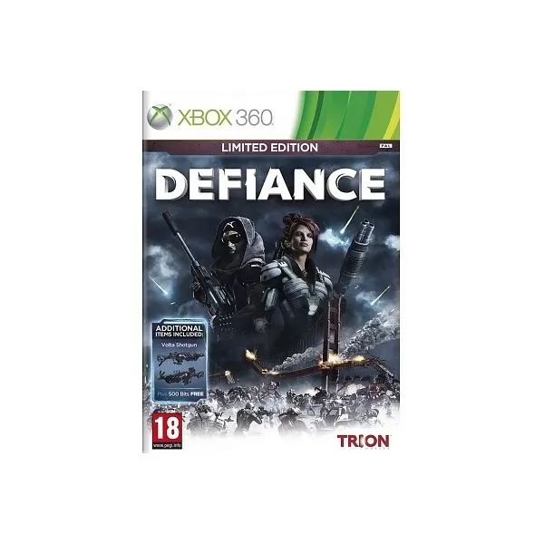 Defiance este un joc MMO shooter cu teme SF, publicat de Trion Worlds. Ideea jocului este inspirata de la seria TV cu acelasi nume, dar are o povestea inedita.<br/>Actiunea din Defiance are loc in zona golfului San Francisco dupa o modificare intensa a mediului Pamantului, ceea ce a dus l-a aparitia de noi specii. Mai multe rase de extraterestrii au venit pe Pamant pentru a se stabilii aici, ceea ce a dus la razboaie, devastand si mai mult planeta. Dupa razboi, oamenii si extraterestrii, Votans, au invatat sa convietuiasca.<br/>Jucatorii pot sa aleaga intra in rolul unor "Ark Hunters" care sunt trimisi de Karl Von Bach (CEO pentru Von Bach Industries) in zona golfului pentru a cauta echipamente extraterestre. Pe langa asta, jucatorii vor avea si alte misiuni pentru a castiga bani si competitii cu alti Ark Hunters.<br/>Caracteristici;<br/>1. CO-OP masiv (1000 de jucatori) - OPEN WORLD CO-OP MISSIONS<br/>2. Shadow War (mai mult de 100 jucatori) - OPEN WORLD CAPTURE AND HOLD<br/>3. Ark Falls (50 de jucatori) - MULTI-STAGE DYNAMIC BOSS BATTLES<br/>4. VS Maps (pana la 32 de jucatori) - BOTH VEHICLE AND TRADITIONAL COMBAT GAMEPLAY MODES<br/>Defiance Limited Edition contine;<br/>- Bonus weapon; Volter Shotgun<br/>- In-game currency ; 500 Bits