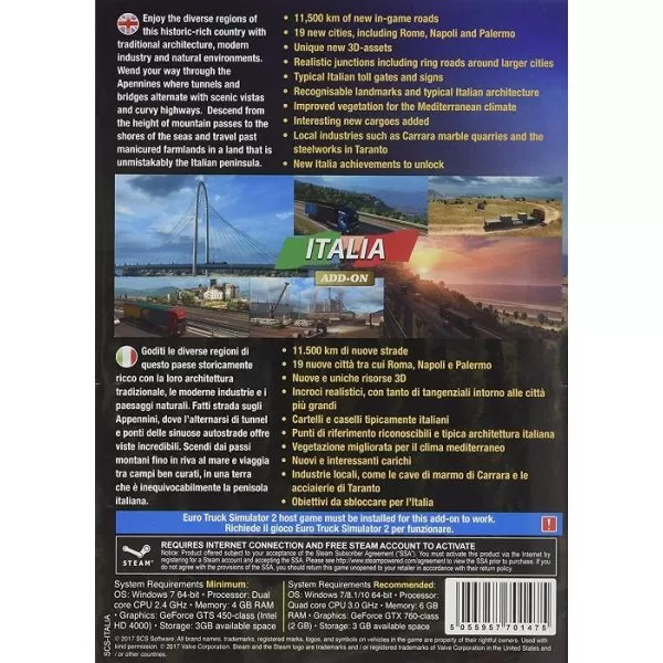 Al patrulea pachet de expansiune pentru Euro Truck Simulator 2 dezvoltat de SCS Software. De data aceasta, dezvoltatorii s-au concentrat pe teritoriul Italiei. Zona a fost imbogatita cu locuri nedisponibile anterior, iar locatiile existente au devenit mai detaliate. Euro Truck Simulator 2: Italia pentru PC / Windows nu introduce nicio modificare in mecanica gameplay-ului versiunii de baza a jocului. Dezvoltatorii s-au axat pe extinderea teritoriului titularului Italiei care era prezent in Euro Truck Simulator 2 doar intr-o forma foarte limitata. Expansiunea imbunatateste foarte mult aceasta zona oferind o harta detaliata care este mult mai credincioasa realitatii. In timpul jocului, jucatorul poate vizita mai multe orase si zone industriale si poate observa obiective turistice unice care fac calatoria pe drumurile italiene mult mai placuta.