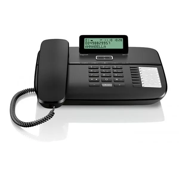 Gigaset DA710 (telefon analogic, sunet de calitate inalta, handsfree, afisaj alfanumeric/semigrafic cu unghi reglabil, iluminat, cu 3 linii, 16 digiti si 5x7 segmente, afisare: data si ora, durata apelului, CLIP, tasta redial, tasta mute, blocare electronica, 8 taste de memorie cu 2 niveluri, agenda telefonic pentru 100 intrari (max. 32 cifre si 16 caractere), lista ultimelor 50 apeluri pierdute, tasta cu LED pentru semnalizarea vizuala a apelurilor primite, functie de agenda -memorarea numarului in timpul convorbirii, volum reglabil, tasta recall cu 5 timpi de flash, mufa RJ9 pentru conectare casca, posibilitatea montarii pe perete, culori disponibile: negru)