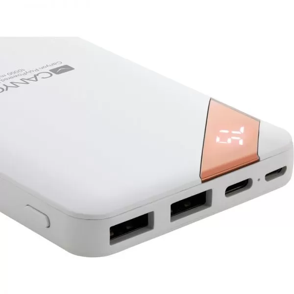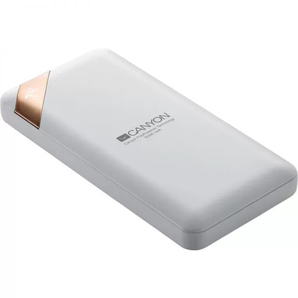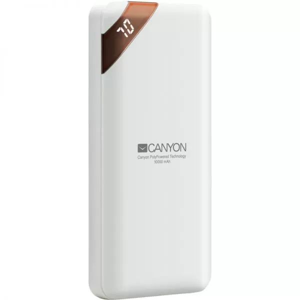 CANYON Power bank 10000mAh Li-poly battery, Input 5V/2A, Output 5V/2.1A(Max), with Smart IC and power display, White, USB cable length 0.25m, 137*67*13mm, 0.230Kg