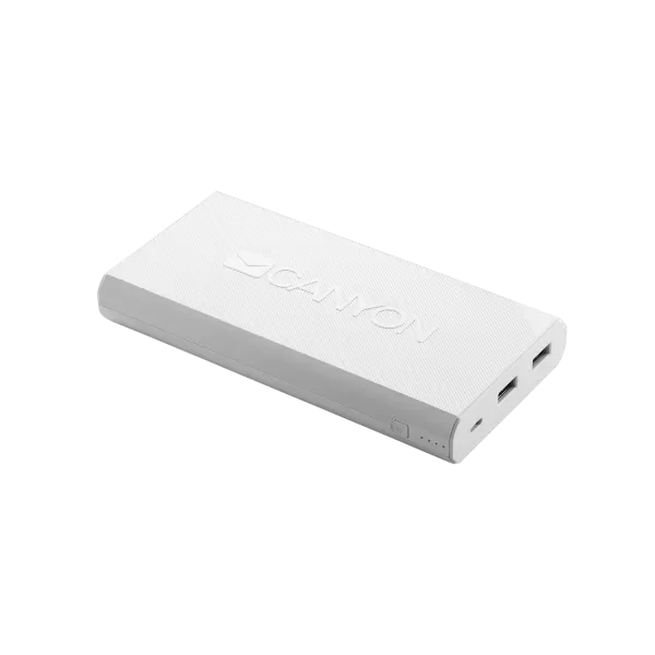 CANYON Power bank 20000mAh built-in 18650 Lithium-ion battery, max output 5V2.4A, input 5V2A, White, Micro USB cable length 0.25m, 161*81*22mm.0.474Kg