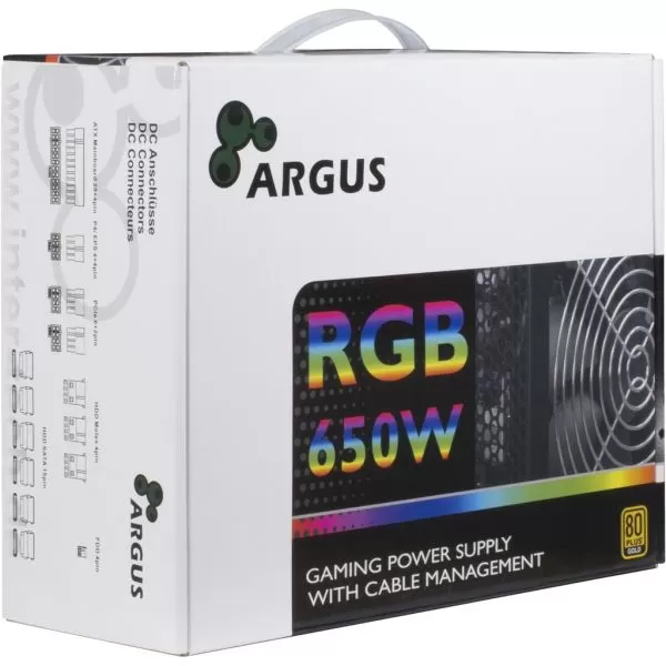 Inter-Tech Argus RGB-650 Modular 650W PSU, certificata 80+ Gold, eficienta 88%, single rail (54A), ventilator silentios de 140mm cu control termic automat, iluminare LED RGB cu 3 moduri de iluminare, panouri laterale transparente, 1x 20+4pin, 2x 6+2pin PCIE, 6x SATA, 3x Molex, 1x Floppy, 1x 4+4pin EPS12V, SCP/OPP/OVP, Active PFC, dimensiuni: 86 x 150 x 160mm, greutate: 1.92kg