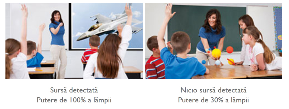 Mod SmartEco Modul SmartEco, regleaza in mod inteligent puterea lampii pentru a reduce consumul energetic, oferind cel mai bun contrast si cea mai buna luminozitate, folosind atata lumina cat este necesara. |