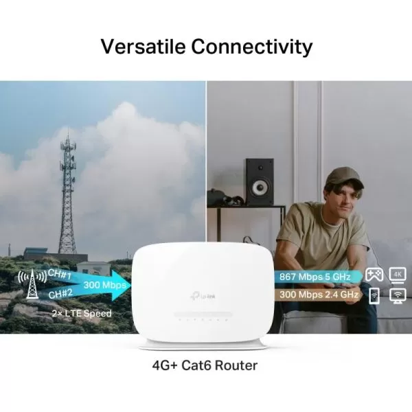 AC1200 4G LTE Advanced Cat6 Gigabit Router Build-In 300Mbps 4G+ LTE Advanced Modem SPEED: 867 Mbps at 5 GHz + 300 Mbps at 2.4 GHz, 4G+ Cat6 300/50 Mbps SPEC: Internal Antennas, 2× Gigabit LAN Ports, 1× Gigabit WAN/LAN Port, LTE-FDD/LTE-TDD/DC-HSPA+/HSPA+/HSPA/UMTS FEATURE: Tether App, WPA3, Cloud Support, Parental Controls, QoS, EasyMesh