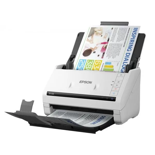 Scanner Epson DS-530, dimensiune A4, tip sheetfed, viteza scanare: 70 ipm alb-negru si color, rezolutie optica 600x600dpi, ADF Single Pass 50 pagini, duplex, senzor CCD, Scan to e-mail, Scan to FTP, Scan to Print, Scan to folder web, Scan to network folder, software : Epson Document Capture (Doar Mac), Epson Document Capture Pro (Windows only), Server Epson Document Capture Pro (descărcare gratuită), Epson Scan 2, Newsoft Presto BizCard 5.6, interfata: USB 3.0, optional retea.