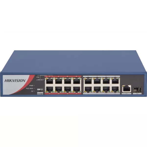 Switch POE 16 porturi Hikvision DS-3E0318P-E;fara management; L2, Unmanaged, 16 100M PoE port, 2 1000M combo port, 802.3af/at, PoE power budget 230W