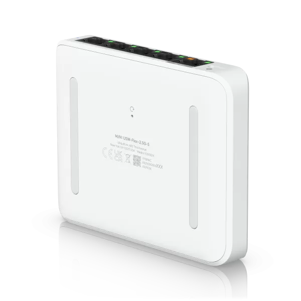 Ubiquiti USW-Flex-2.5G-5, 5 porturi RJ45 1/2.5 GbE, capacitate 25 Gbps, 1 adaptor de alimentare AC, 5V DC, 1A, 1 PoE (PairA 1, 2+; 3, 6-)(PairB 4, 5+; 7, 8-), dimensiuni 117.1 x 90 x 21.2 mm (4.6 x 3.5 x 0.8")
