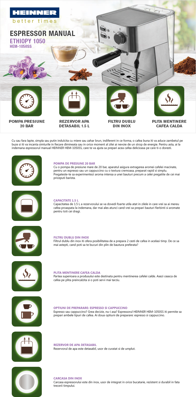 | Caracteristici Espressor cafea Heinner HEM-1050SS, 1050W, Argintiu: | |