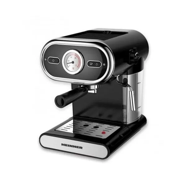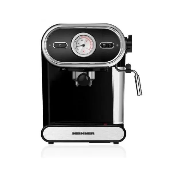 Espressor cu ceas Heinner HEM-1100BK, presiune: 15 bar capacitare rezervor: 1 L, termometru frontal, preparare espresso si spumare lapte, tavite pentru scurgere detasabila, 2 filtre inox putere: 1100W, negru
