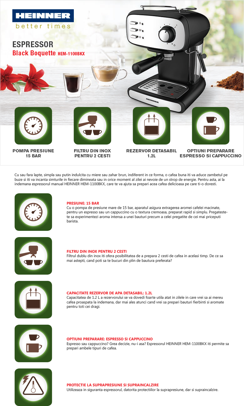 | Caracteristici Espressor cafea Heinner HEM-1100BKX, 850W, Negru: | |