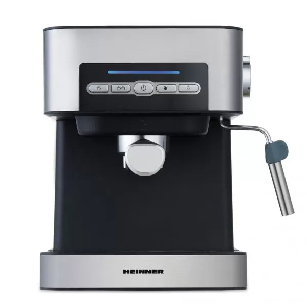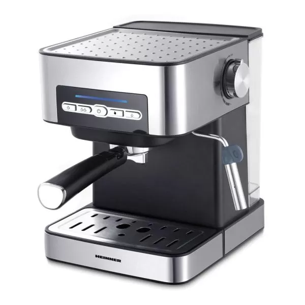 Espresor Heinner HEM-B2016SA, optiuni de preparare: espreso si spuma de lapte, capacitate rezervor apa detasabil: 1.6L, pompa de presiune: 20 bar, optiuni presetate pentru 1 ceasca si 2 cesti de cafea, filtru dublu din inox, tavita de scurgere detasabila, plita pentru mentinere la cald, protectie supraincalzire, indicator LED ON, indicator LED gata de folosire, carcasa din inox, putere: 850W