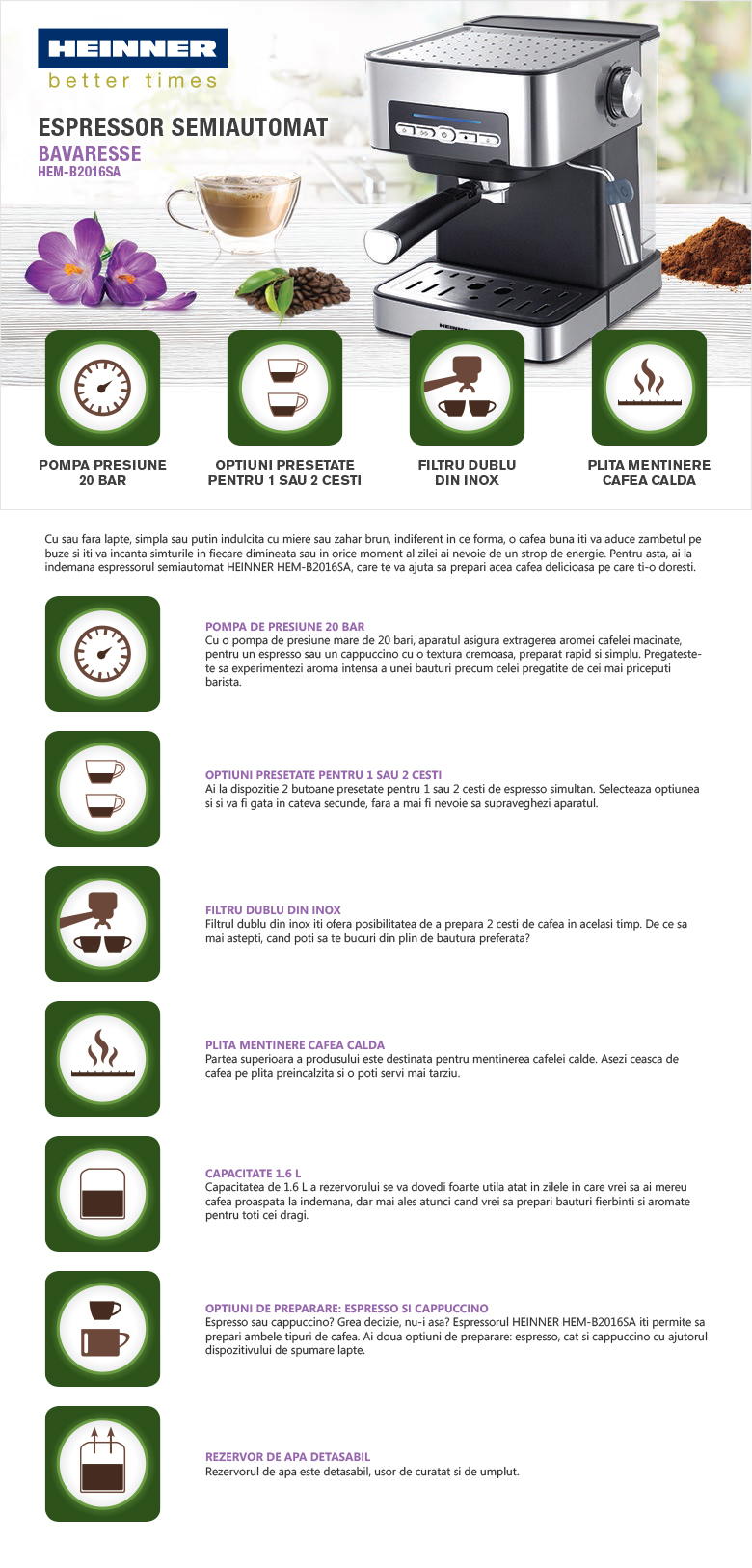 | Caracteristici Espressor cafea Heinner HEM-B2016SA, 850W, Inox: | |