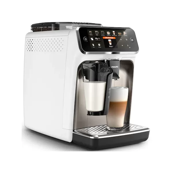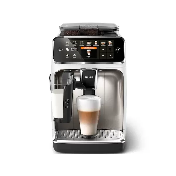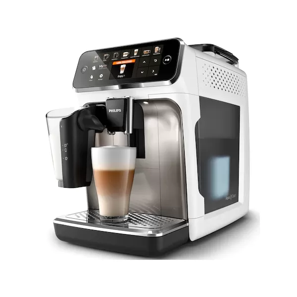Espressor automat Philips EP5443/90, sistem de lapte LatteGo, 12 bauturi, display digital TFT si pictograme color, filtru AquaClean, rasnita ceramica, optiune cafea macinata, functie MEMO 4 profiluri, alb