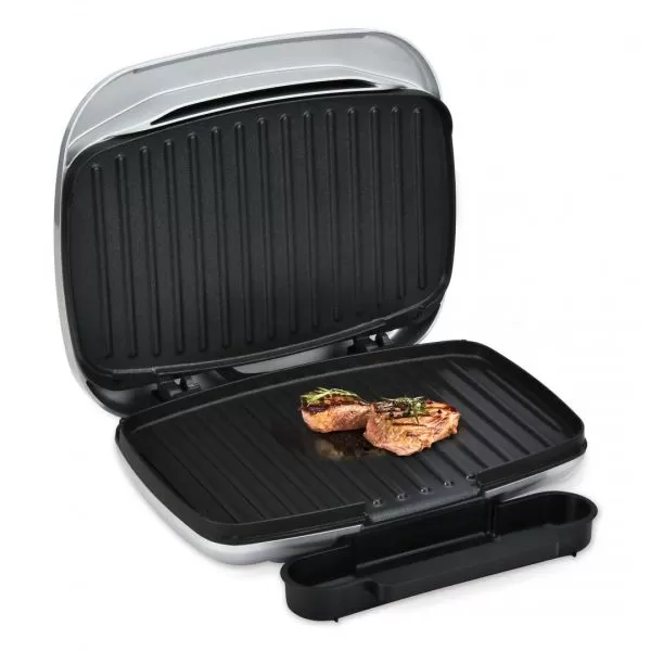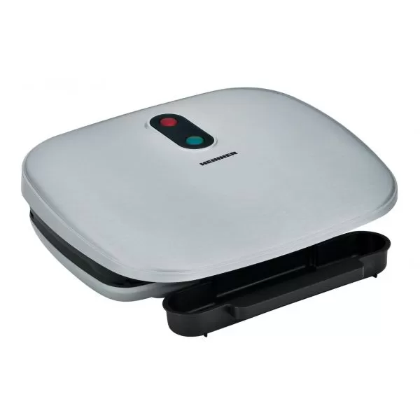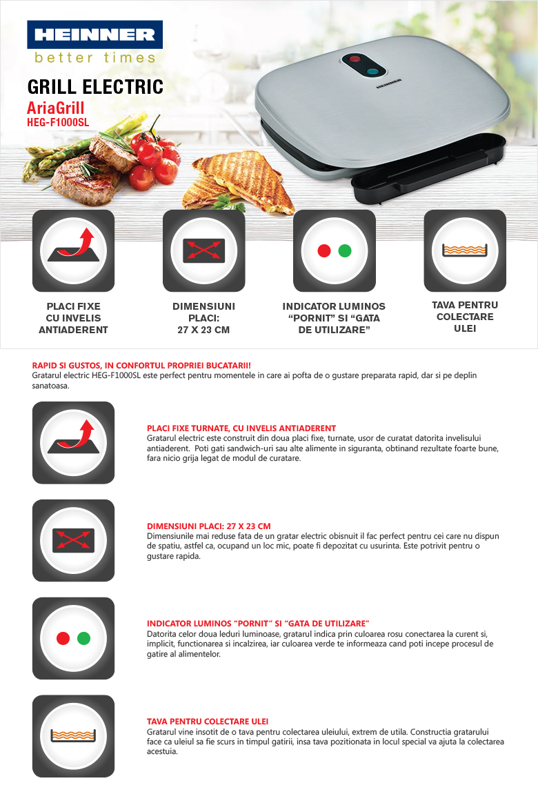 Gratar electric Heinner AriaGrill HEG-F1000SL, placi turnate fixe, invelis antiaderent, maner rece, indicator luminos “ON” si “Gata de folosire”, tava pentru colectare ulei, putere: 1000W