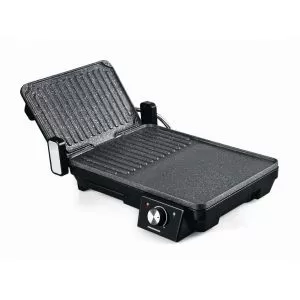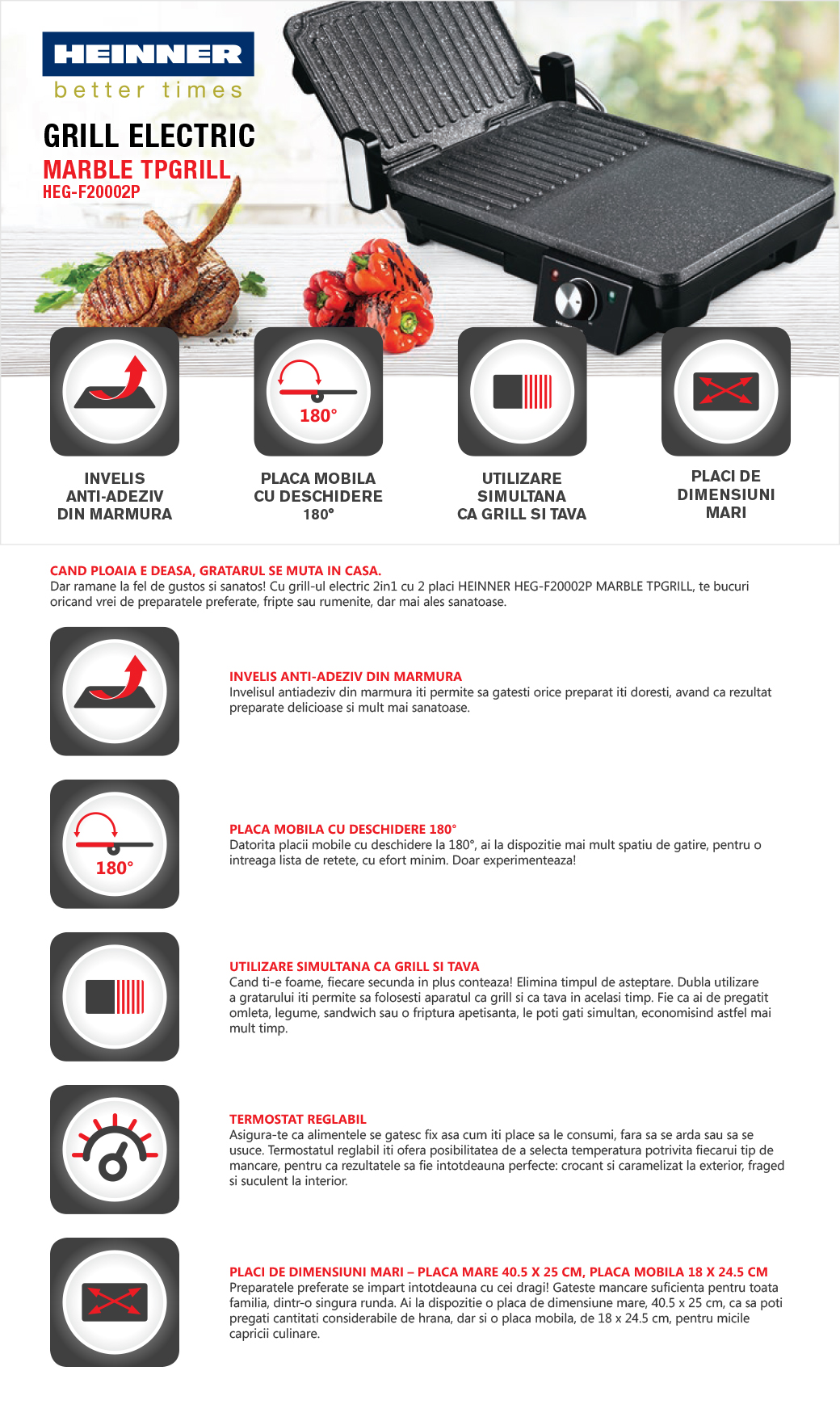 Grill electric cu 2 placi Heinner HEG-F20002P, 2000W, placi din aluminiu turnat cu acoperire non-stick, temperatura reglabila, placa mare: 41 x 25.5 cm, placa mica: 25.5 x 19.5 cm