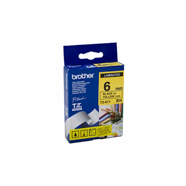 Bandă laminată Brother TZ611, 8m/6mm negru/galben