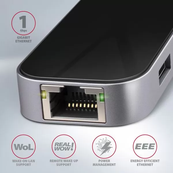 AXAGON HMC-6GL 3x USB-A, HDMI, RJ-45, USB 3.2 Gen 1 hub, PD 100W, 20cm USB-C cable Intrare: • 1x USB 3.2 Gen 1 / Port USB SuperSpeed, conector USB-C masculin. • Compatibil înapoi cu conector USB 3.1 Gen 1 / USB 3.0 / USB 2.0. • Compatibil cu Thunderbolt 3. • Intrare conector USB tip C masculin pe cablu fix de 20 cm. Iesiri USB: • 3x port USB SuperSpeed, conector USB-A feminin. • 1x USB tip C Port power delivery (numai încărcare) conector feminin USB-C. • Suportă rate de transmisie 5.000 / 480 / 12 / 1.5 Mb / s (SuperSpeed / Mare / Full / Viteză mică). • Lățimea de bandă totală / rata de transmisie a cutiei este determinată de interfața USB 3.2 Gen 1 utilizată (teoretic până la 5 Gbit / s). • Hub-ul USB-C poate gestiona conectarea mai multor unități externe simultan. • Încărcarea dispozitivelor mobile (inclusiv iPad) cu curent de până la 1,5A în fiecare dintre porturile hub-ului. Curentul total de încărcare (care este împărțit în porturi) ajunge până la 2.1A la 5V (în funcție de capacitățile portului USB al computerului). Ieșire HDMI: • HDMI. • Conector HDMI A (F) feminin. • Rezoluție maximă acceptată 4K / 4096 x 2160 la 30 Hz. • Rezolutie WQHD 2560 x 1440 la 60 Hz max. • Rezoluție FullHD 1920 x 1080 la 60, 100, 120 Hz max. • DisplayPort Alternate Mode (DP Alt Mode) activat port USB-C sau Thunderbolt 3 port este necesar pentru buna functionare a iesirii video. În același timp, este necesar suportul de pe dispozitiv (laptop, telefon) și sistemul de operare. Funcția de ieșire video nu va fi disponibilă fără aceste cerințe. • Suport HPD (Hot-Plug-Detect). • Suport TMDS (Transition Minimized Differential Signaling). • Suport full HDCP 1.4 și 2.3 (High-bandwidth Digital Content Protection). • Audio LPCM cu până la 8 canale, audio comprimat (AC-3, DTC) și suport pentru format audio HBR. • Rata de eșantionare de până la 192 kHz și suport audio pe 24 de biți - depinde de sursa și dispozitivul țintă, adică notebook / telefon și receptor TV / display / AV. RJ-45 Output • Interfata Gigabit Ethernet cu conector RJ-45 pentru conectarea prin cablu UTP sau STP. • Rate de transmisie acceptate pentru interfața Ethernet 10/100/1000 Mb/s. • Suport pentru caracteristici Wake-on-LAN în diferite moduri Acceptă modul de repaus și Trezirea de la distanță prin Magic Packet, Microsoft Wakeup Frame, Microsoft Wake Packet Detection, ECMA-393 proxZzzy® pentru gazdele de dormit, RealWoW! și, de asemenea, Link Change wake-up. Alimentare: • Suport Power Delivery 3.0 – sursa de alimentare a dispozitivului de la încărcătorul de perete PD prin hub USB-C. • Alimentare maxima prin iesire hub PD USB-C 60W - 20V/3A. • Notebook sau telefon cu suport de încărcare Power Delivery de la portul USB-C și este necesar un încărcător PD adecvat. Alte caracteristici: • Posibilitatea de a conecta dispozitivul în timp ce rulează datorită suportului Hot Plug. • Suport complet Plug and Play. • Suport pentru modul standby. • Alimentare prin magistrală USB - alimentare usb bus sau de la încărcător de perete PD. • Corp din aluminiu greu pentru o răcire mai bună a butucului. Temperatura mai mare a butucului de suprafață nu este o problemă - căldura generată de funcționarea butucului este mai bine disipată și transferată în împrejurimi. • Lumina de fundal a logo-ului indică conexiunea portului USB al computerului (lumină constantă). • Cablul ecranat de înaltă calitate asigură o viteză mare de comunicare și interferențe nedorite minime. • Dimensiuni 110 x 35 x 13 mm. • Greutate 60 g (inclusiv cablu). • Lungimea cablului USB 20 cm.