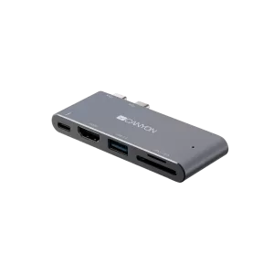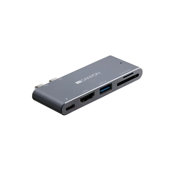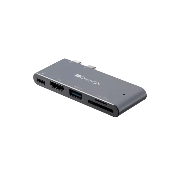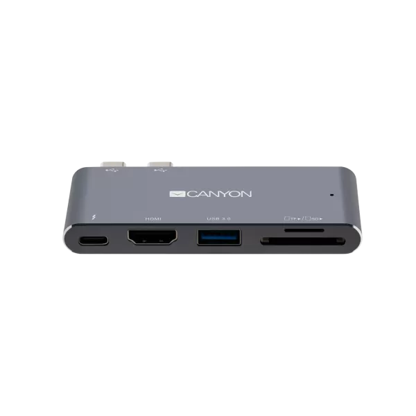 Canyon Multiport Docking Station with 5 port, with Thunderbolt 3 Dual type C male port, 1*Thunderbolt 3 female+1*HDMI+1*USB3.0+1*SD+1*TF. Input 100-240V, Output USB-C PD100W&USB-A 5V/1A, Aluminium alloy, Space gray, 90*41*11mm, 0.04kg