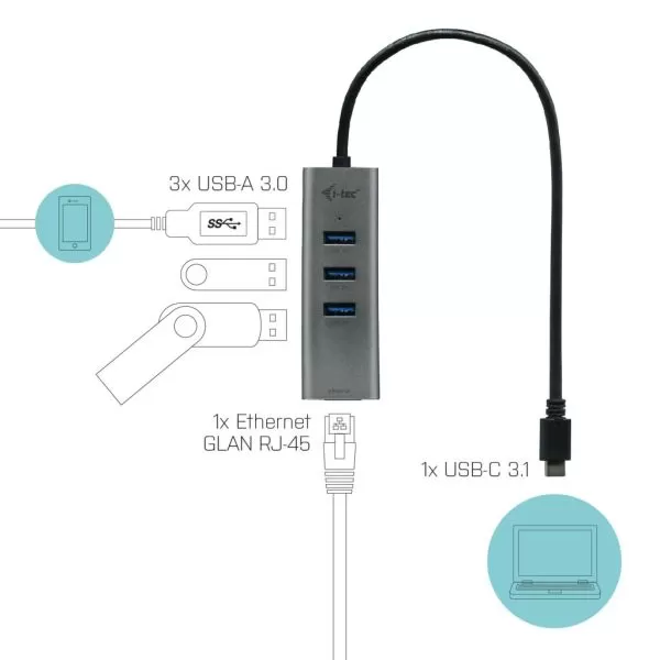 ITEC C31METALG3HUB i-tec USB C Metal 3 port HUB Gigabit Ethernet 1x USB C to RJ-45 3x USB 3.0 LED