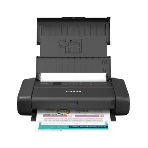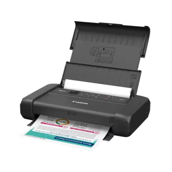 Imprimanta inkjet color portabila Canon BX110 cu acumulator, culoare: negru, dimensiune A4, viteza 9ipm alb-negru, 5,5ipm color, rezolutie 4800 x 1200 dpi, alimentare hartie 50 coli, interfata Hi-Speed USB (USB Type C), Wireless, Google Cloud Print, Air Print, USB charging, consumabile: PGI-35 (200 pag.), CLI-36 (260 pag.), include acumulator reincarcabil.