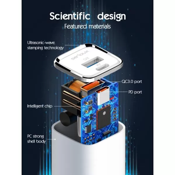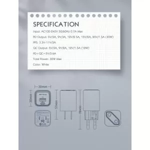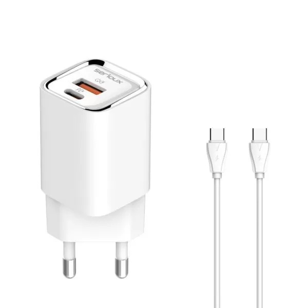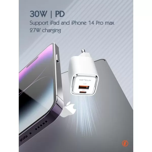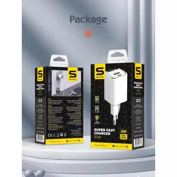 Incarcator retea Serioux,Intrare AC100-240V~ 50/60Hz 0.7A Max,PD Ieșire: 5V-3A, 9V-3A, 12V-2.5A, 15V 2A, 20V=1.5A (30W), QC Ieșire: 5V-3A, 9V-2A, 12V=1.5A (18W), PD+QC=5V=3.6A, Total: 30W Max, Cablu Type-C - Type C 1m inclus