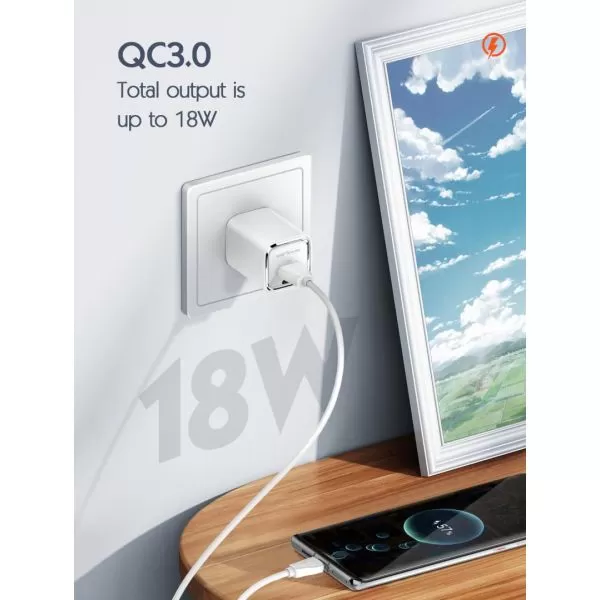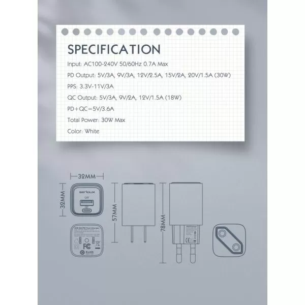 Caracteristici Incarcator retea Serioux QC30W, 30W, Quick Charge, USB-C, USB-A, White: