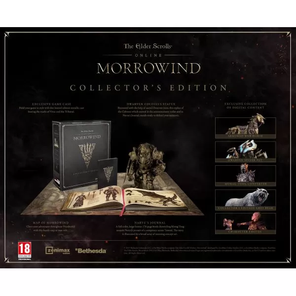 The Elder Scrolls Online: Morrowind Collector’s Edition conţine: - jocul The Elder Scrolls Online: Morrowind - cutie de colecţie exclusivă - statuetă Dwarven Colossus - harta Morrowind - jurnalul lui Naryu - conţinut digital exclusiv The Elder Scrolls Online: Morrowind este următorul capitol, semnat de ZeniMax Online Studios, al RPG-ului online The Elder Scrolls Online (ESO), câştigător a numeroase premii. Această nouă aventură îi readuce pe fanii Elder Scrolls pe insula legendară Vvardenfell, acelaşi mediu emblematic prezentat şi în The Elder Scrolls III: Morrowind, jocul de tip open-world al Bethesda Game Studios, care a definit genul RPG. Incluzând o zonă nouă enormă, o clasă nouă de jucători, peste 30 de ore conţinut in modul story, un Trial nou, o nouă echipă de trei şi modul PvP 4v4v4,The Elder Scrolls Online: Morrowind este cea mai mare completare de până acum a lui The Elder Scrolls Online, oferind o aventură nouă veteranilor ESO dar şi o poveste proaspătă celor care încearcă seria pentru prima dată.