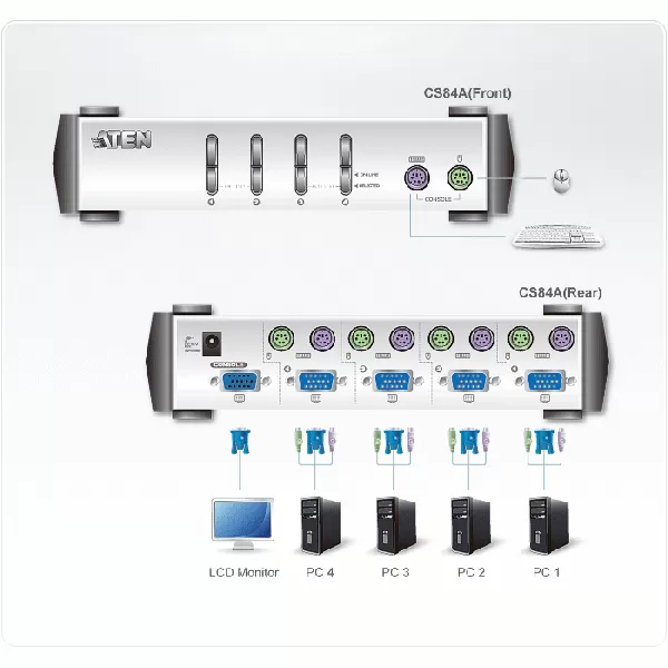 | Nume produs | ATEN CS84A 4-Port PS/2 KVM Switch, 4x PS/2 Cables, 1 Front console, Non-powered |