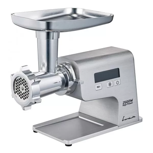 Masina de tocat Fram FMG-MDT2500X, putere maxima: 2500W, angrenaj metalic , accesoriu rosii , motor DC, display LCD, cutit inox , 2 site din inox, accesorii pentru carnati si kibbe , carcasa aluminiu turnat
