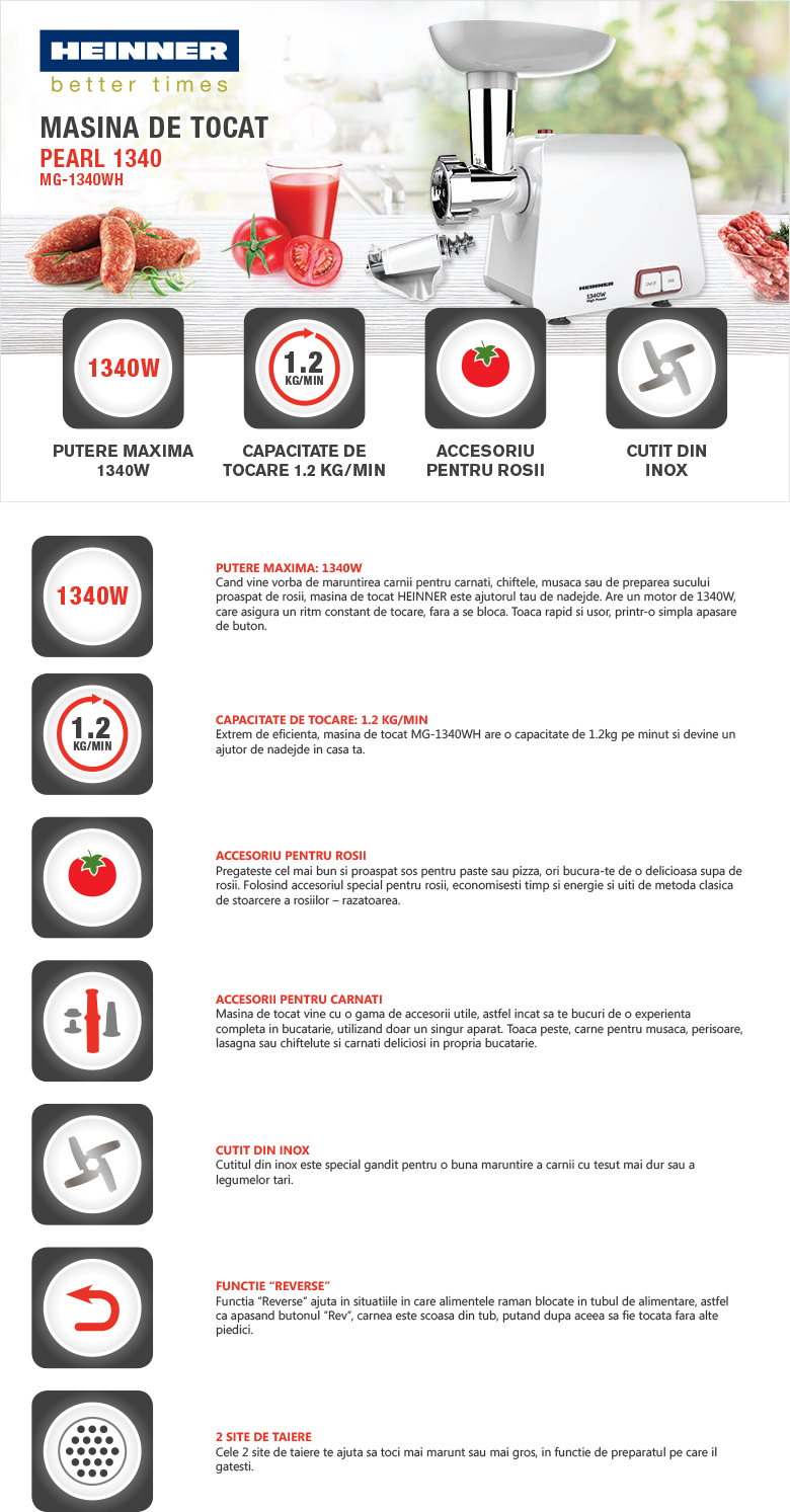 | Caracteristici Masina de tocat Heinner Onyx MG-1340W, 1340W, Alb: | |