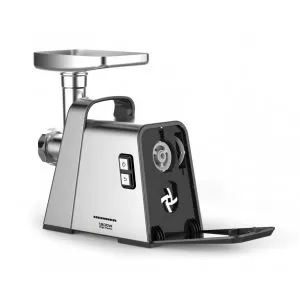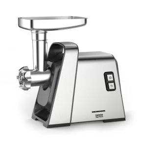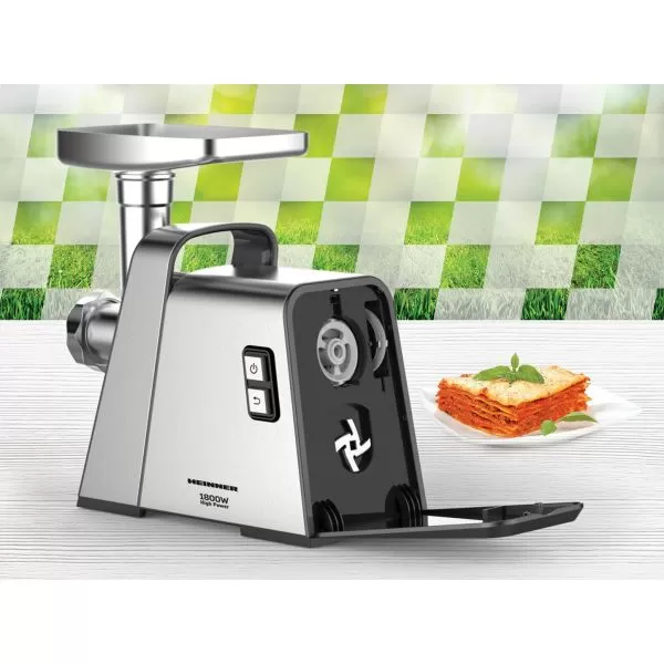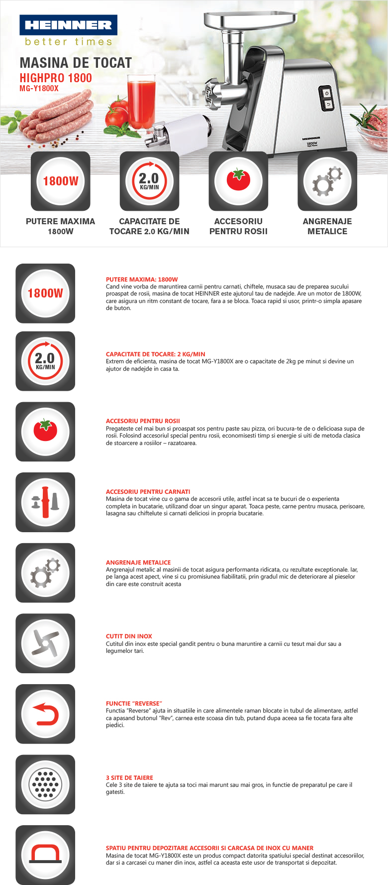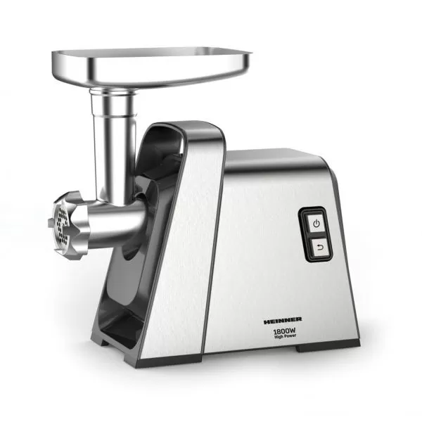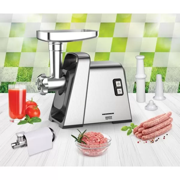 Masina de tocat carne Heinner MG-Y1800X, putere maximă: 1800W, accesoriu pentru roșii, accesoriu pentru cârnați, angrenaje metalice, cuțit din inox, funcție „Reverse", 3 site de tăiere, spatiu depozitare accesorii, carcasa de inox cu mâner, capacitate de tocare: 2 kg/min