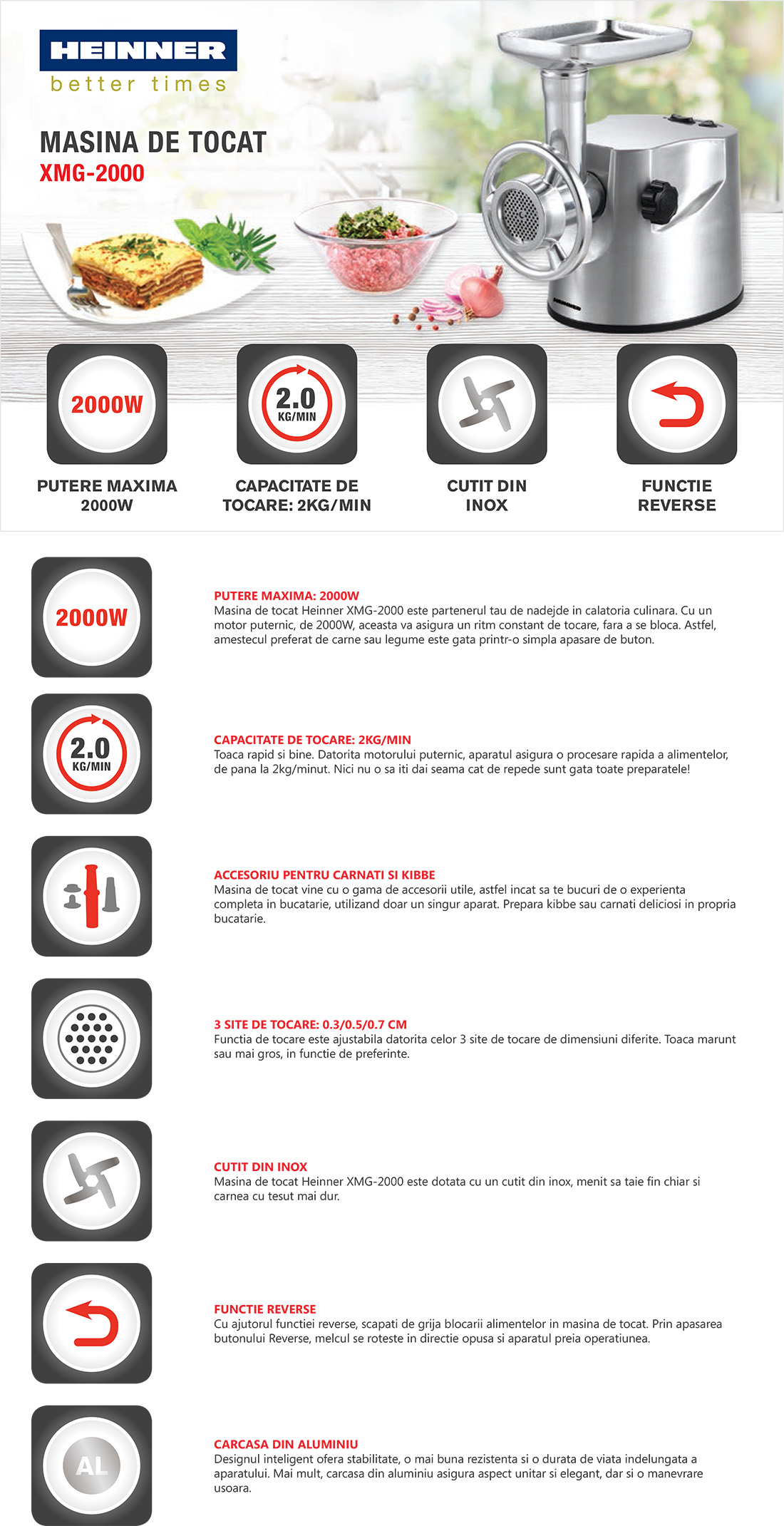 Masina de tocat carne Heinner PowerMix 2000 XMG-2000, capacitate de tocare: 2kg/min, marime cap tocare: #8, functie reverse, accesoriu pentru carnati, accesoriu pentru kibbe, cutit din inox, 3 site de tocare metalice, carcasa din aluminiu, putere maxima: 2000W, nivel de zgomot: <(><<)>90dB