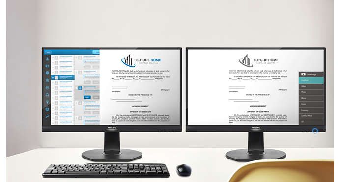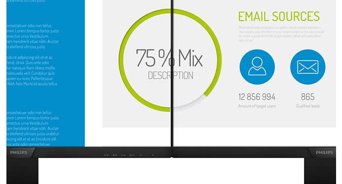 | Afisaj cu margine ingusta pentru aspect optim Noile afisaje Philips dispun de margini extrem de inguste permitand distrageri minime si dimensiunea de vizionare maxim posibila. Special conceput pentru configurarea tip cadre sau cu multi-afisaj, cum ar fi jocurile, designul grafic si aplicatiile profesionale, afisajul extrem de ingust iti da sentimentul ca utilizezi un singur ecran mare. |