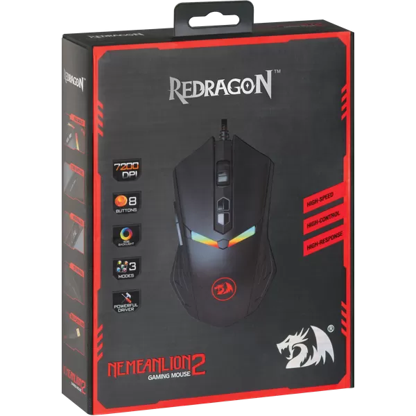 Redragon Nemeanlion2 RGB, 7200 DPI, numar butoane: 8, iluminare LED RGB (3 moduri de iluminare), durata de viata a micro switch-urilor: 10 milioane de click-uri, picioruse de teflon, conector USB placat cu aur, lungime cablu: 1.8m, dimensiuni: 123.5x71x38mm, greutate: 135.8g, USB