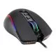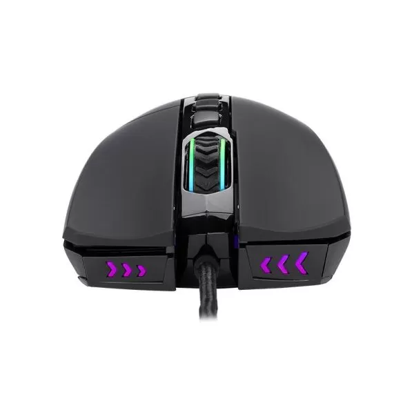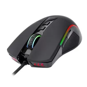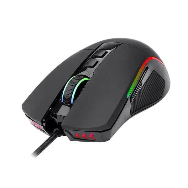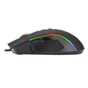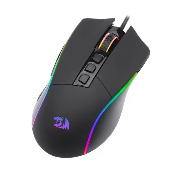 Mouse gaming Redragon Plank iluminare RGB, 16000 DPI, tracking speed: 400IPS, acceleratie: 50G, FPS ajustabil, senzor Pixart PAW3333DB, micro switch-uri Huano albastre, numar butoane: 9 (9 programabile), 7 moduri de iluminare (16 milioane de culori disponibile), program pentru configurare (macro-uri, profile, mod iluminare, etc.), picioruse de teflon, conector USB placat cu aur, lungime cablu: 1.8m, dimensiuni: 129x67.5x40.5mm, greutate: 143g
