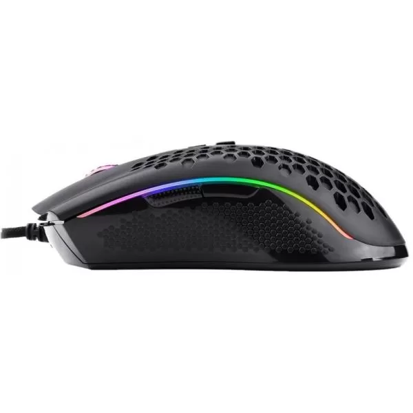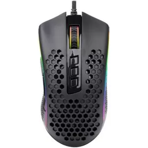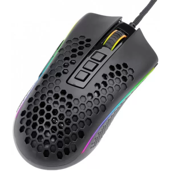 Mouse gaming Redragon Storm iluminare RGB negru, carcasa perforata pentru o aerisire mai buna a mainii, iluminare RGB, 12400 DPI, 200IPS, acceleratie 30G, polling rate: 1000/500/250/125Hz, senzor optic Pixart 3327, micro switch-uri Omron (durata de viata: 20 milioane click-uri), numar butoane: 9 (7 programabile), 5 moduri de iluminare (16.8 milioane de culori disponibile), picioruse de teflon, conector USB placat cu aur, lungime cablu: 1.8m, dimensiuni: 126.8x65.5x41mmmm, greutate: 88g, USB