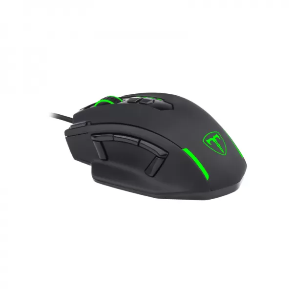 Mouse gaming T-Dagger Major negru, 8000 DPI, 1000Hz, 20G acceleratie, numar butoane mouse: 12 (11 programabile), iluminare LED RGB a mouse-ului, picioruse de teflon, cablu imbracat in material textil, lungime cablu mouse: 1.8m, include set greutati (8x 2.25g), dimensiuni: 124x90x40mm, greutate: 173g (incluzand greutatile suplimentare), USB