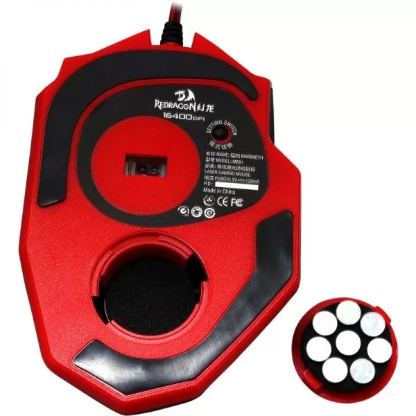 Redragon Mammoth, 16400 DPI, 12000 FPS, acceleratie 30G, polling rate: 1000/500/250/125Hz, senzor laser Avago A9800, micro switch-uri Omron (durata de viata: 5 milioana click-uri), numar butoane: 10 (9 programabile), 5 moduri de iluminare (16 milioana de culori disponibile), include program pentru configurare (macro-uri, profile, mod iluminare, etc.), picioruse de teflon, conector USB placat cu aur, lungime cablu: 1.8m, dimensiuni: 121x81x41mm, greutate: 155g (incluzand greutati 2.4g x 8 bucati), USB