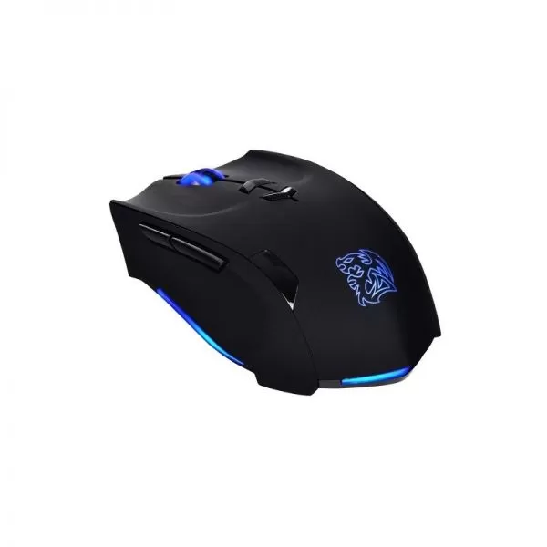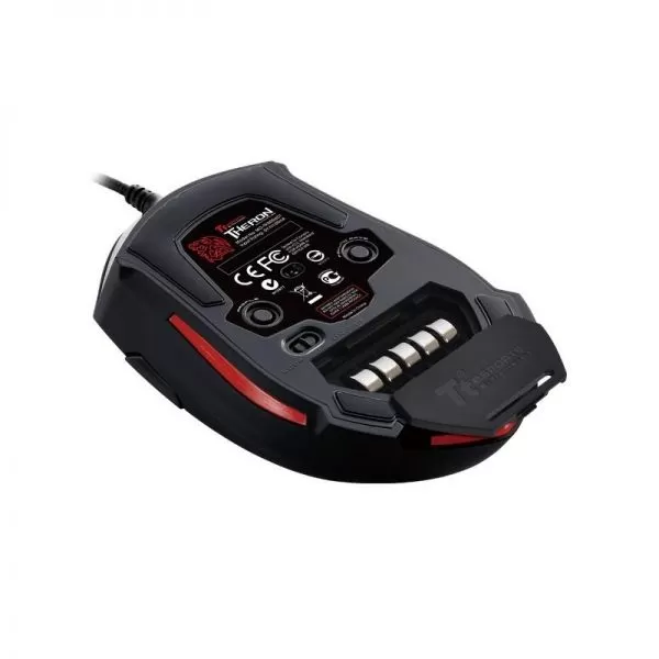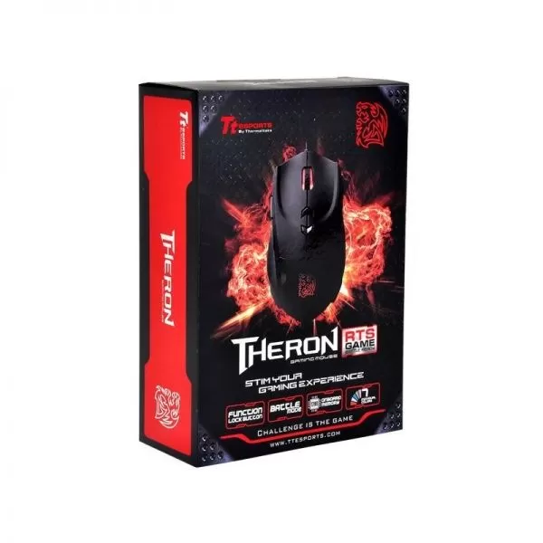 Tt eSPORTS THERON, 100-5600 DPI, senzor laser T.P.G. (Tt Pro Grade), posibilitatea schimbarii culorii care ilumineaza mouse-ul (7 culori disponibile), 128kb memorie on-board (5 profile, 40 taste macro, salvarea setarilor), buton pentru schimbarea polling rate-ului (125/500/1000 Hz), switch-uri Omron, greutati: 4.5g x5, lungime cablu: 1.8m, picioare de teflon, conector USB placat cu aur, dimensiuni: 123.65 x 73.8 x 40.2mm, USB