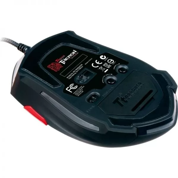 Tt eSPORTS THERON Infrared, 100-4000 DPI, senzor optic infrarosu, numar butoane: 8, 128kb memorie on-board (5 profile, 40 taste macro, salvarea setarilor), buton pentru schimbarea polling rate-ului (125/500/1000 Hz), switch-uri Omron, greutati: 4.5g x5, lungime cablu: 1.8m, picioare de teflon, conector USB placat cu aur, dimensiuni: 123.65 x 73.8 x 40.2mm, USB