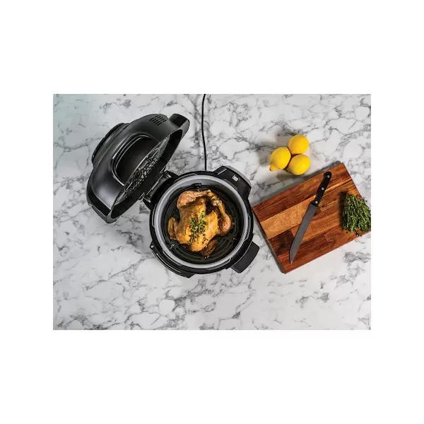 Pregatiti rapid si usor mancaruri delicioase, garnituri si deserturi cu functiile de gatit sub presiune, prajire cu aer cald, gatire lenta, gatire la aburi, coacere / prajire si prajire / prajire. Aparatul este perfect pentru doua persoane - de exemplu: Puteti gati un pui intreg de 1,5 kg si il puteti praji pana devine crocant.