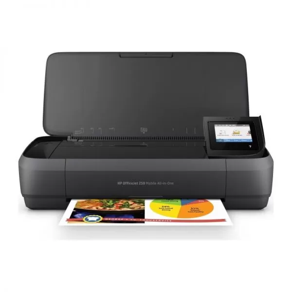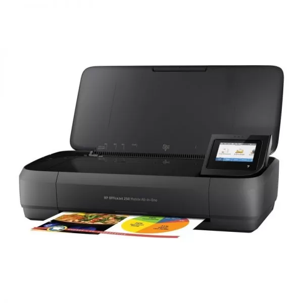 Multif. inkjet A4 HP OfficeJet 250 Mobile AiO CZ992A HP OfficeJet 250 Mobile All-in-One Printer; print, scan, copy, A4, color, portabila, viteza (ISO) : max 10ppm black, 7 ppm color (CA), 9 ppm black, 6 ppm color (baterie), viteza (draft) : max 20ppm black si color (CA), 18 ppm black si color (baterie), fpo 13 sec black (CA), 14 sec color (CA), 20 sec mono, 22 sec color (baterie), rezolutie 1200x1200dpi max 4800x1200dpi, memorie 256MB RAM, procesor 700MHz, tava 50 coli, ADF 10 coli, HP PCL3 GUI, LCD color 6.73cm touch; copy : viteza (ISO) max 8ppm black, 4 ppm color (CA), 7 ppm black, 3 ppm color (baterie), max 600 dpi, scalare 25 - 400%, max 50 copii multiple; scan: sheet-feed, CIS, max 9 ppm mono, 3.6 ppm color, 24-bit, 256 nivele de gri, dimensiuni de scanare 216 x 356 mm; conectivitate: USB2.0, USB host, WiFi , WiFi direct, BLE; cartuse in-box starter HP 62 (120 pag color, 200 pag black), volum recomandat 100 - 300 pag/luna, max 500 pag/luna. Inlocuieste OfficeJet 252 Mobile OEM:CZ992A