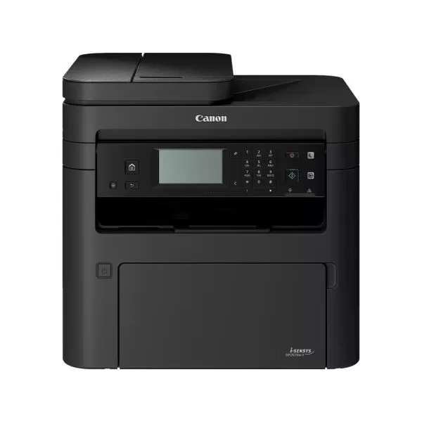 Multif. laser A4 mono fax Canon MF267dw II i-SENSYS MF267dw II, print/scan/copy/fax, A4; print : max 28 ppm (17.8 ppm duplex), max 1200x1200dpi, fpo 5.2 sec, limbaje UFRII LT, PCL5e, PCL6, memorie 256 MB, procesor 400MHz, LCD tactil mono 6 linii, tava 1 + 250 coli, iesire 50 coli, ADF simplex 35 coli; copy: max 28 cpm (17.8 cpm duplex), fco 8.2 sec, max 600x600 dpi, max 999 copii, scalare 25-400%; scan : color, optic 600x600dpi, max 9600x9600 dpi, max 20 ppm mono, 15ppm color (300x600dpi), 24-bit adincime de culoare, 256 niveluri de gri; fax : 33,6 kb/s (~ 3 sec/pag), rezolutie max 200 x 400 dpi, memorie max 256 pag, max 104 apelari rapide, duplex (TX/RX); conectivitate USB 2.0 Hi-Speed, 10BASE-T/100BASE-TX, Wireless 802.11b/g/n, Wireless Direct Connection; Compatibilitate cu Google Cloud Print, iOS: AirPrint, aplicatia Canon PRINT Business, Android: certificare Mopria, plug-inul Canon Print Service, volum lunar recomandat 250-2.500 pag, maxim 30.000 pag, toner in-box 1.6k pag, consumabil ulterior: toner 051 (1.7k), 051H (4.1k), drum 051 (23k); optional kit telefon TEL6. Inlocuieste MF267DW OEM:5938C008AA