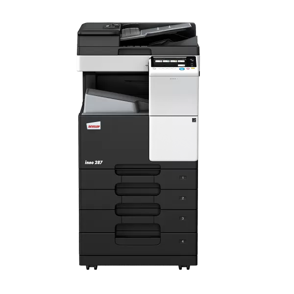 Develop Ineo 287 - Multifunctional Laser A3 alb-negru, viteza de copiere 28 cpm A4. Standard: copiere, printare si scanare color, capacitate hartie: 1.100 coli (inclusiv tava multibypass), max. 3.600 coli; duplex; memorie 2.048 MB; HDD 250GB; Ethernet 10 BaseT/100 BaseT/1000 BaseT, USB 2.0; scanare: max. 45 opm (color/alb-negru), Scan-to-E-mail/FTP/Box (HDD)/PC (SMB)/ WebDAV/Me/Home/USB/DPWS, Twain in retea, format: TIFF, PDF, PDF compact, JPEG, XPS, XPS compact, pptx, docx, xlsx, PDF indexabil, PDF/A, PDF linearizat. Optional: capac originale OC-514 sau alimentator automat documente DF-628, placa fax FK-513, suport mobil DK-513,casete hartie PC-113/PC-213/PC-413,separator joburi, finisare: capsare, perforare, brosurare; suport pentru printare mobila, Wireless Lan. Configuratie minima functionare: cu capac OC-514/DF-628 si toner TN-323 (1 flacon pana la 23k pag). Configuratie minima recomandata: cu DF-628 + DK-513 + TN-323