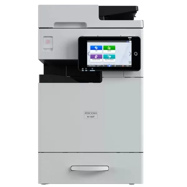IM460F, mfc A4 mono (+A3), 46ppm, 35ppm in duplex, copy/print/scan color to USB, email/FAX, single pass SPDF 50 coli, PCL5 si 6/PS3/PDF, fpo 3,3s, fco 4,1s, procesor 1,2GHz, memorie 6GB + 64GB eMMC (opt 256GB SSD, 320GB HDD), alim 100+500 coli (max 2100), iesire 250 coli, duty 150k/luna, recomandat 10000p/luna, USB/Retea (opt Wifi), display touch 7", scan speed 46ipm/92ipm duplex, warm up 31s, consumabile: toner 842610 (13.5k), 842615 (22k), cilindru D0DM0124 (160k), dimensiuni 37,4x49,3x64 cm, greutate 41kg, garantie 12 luni, on depot.