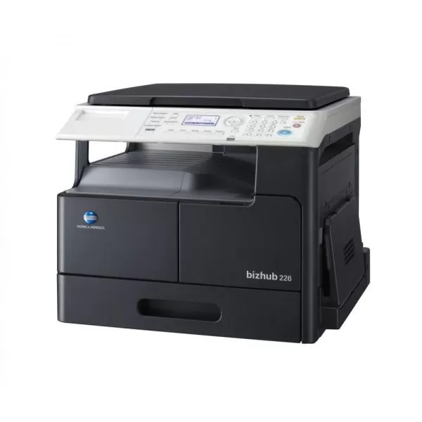 Multifunctional Laser Mono Bizhub 226 - Set copiator + DF-625 + AD-509 + MK-749 + NC-504. Copiator digital A3, 22ppm A4, 8 ppm A3 copiere/printare, fpo. 6.5 sec, rezolutie copiere 600x600dpi, zoom 25-400% in pasi de 0.1% + functie de autozooming. Functii la copiere: 2in1; 4in1; copiere carte; copiere card ID; deplasare/stergere Imagine; rotire Imagine; inregistrare program. Rezolutie printare 600x600 dpi GDI (1200x600 dpi PCL), memorie 128MB, limbaj de printare GDI, (opt. PCL 6/5e). Volum maxim lunar 15.000 pag, recomandat 5.000 pag. Echipamentul contine standard drum, developer, RADF, Duplex, retea, tava alimentare Hartie 250 coli + bypass 100 coli. Optional: fax, stand, 4 tavi de alimentare cu Hartie de 250 coli, Wireless Adapter, capsator 50 coli. Tonerul are capacitatea de 12.000 pag si se achizitioneaza separat TN-118. Garantie 1 an sau 60.000 pag, inlocuitorul lui Bizhub 215, cablu alimentare se factureaza separat.
