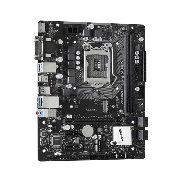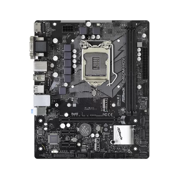 Placa de baza AsRock B460M-HDV Socket LGA 1200 Supports 10th Gen Intel® Core™ Processors (Socket 1200) 7 Power Phase Design Supports DDR4 2933 MHz 1 PCIe 3.0 x16, 2 PCIe 3.0 x1, 1 M.2 Key E for WiFi Graphics Output Options: HDMI, DVI-D, D-Sub 7.1 CH HD Audio (Realtek ALC887 Audio Codec), Nahimic Audio 4 SATA3, 1 Ultra M.2 (PCIe Gen3 x4 & SATA3) 8 USB 3.2 Gen1 (4 Front, 4 Rear) Intel® Gigabit LAN https://www.asrock.com/mb/Intel/B460M-HDV/index.asp