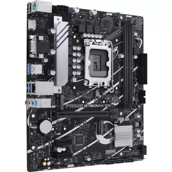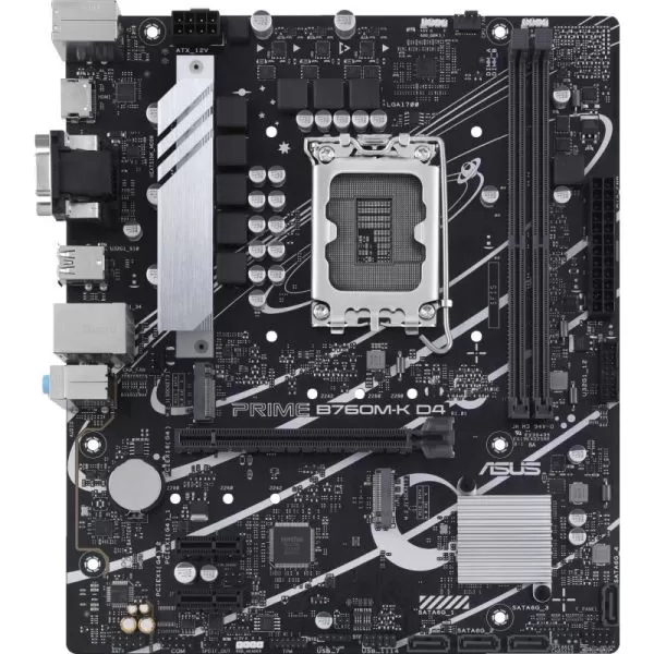 Placa de baza ASUS PRIME B760M-K DDR4 LGA1700 Model PRIME B760M-K D4 CPU Intel® Socket LGA1700 for 13th Gen Intel® Core™ Processors & 12th Gen Intel® Core™, Pentium® Gold and Celeron® Processors* Supports Intel® Turbo Boost Technology 2.0 and Intel® Turbo Boost Max Technology 3.0** * Refer to www.asus.com for CPU support list. ** Intel® Turbo Boost Max Technology 3.0 support depends on the CPU types. Chipset Intel® B760 Chipset Memory 2 x DIMM, Max. 64GB, DDR4 5333(OC)/5066(OC)/5000(OC)/4800(OC)/4600(OC)/4400(OC)/4266(OC)/4000 (OC)/3733(OC)/3600(OC)/3466(OC)/3400(OC)/3333 (OC)/3200/3000/2933/2800/2666/2400/2133 Non-ECC, Un-buffered Memory* Dual Channel Memory Architecture Supports Intel® Extreme Memory Profile (XMP) * Supported memory types, data rate (speed), and number of DRAM modules vary depending on the CPU and memory configuration, for more information please refer to CPU/Memory Support list under the Support tab of product information site or visit https://www.asus.com/support/. Graphics 1 x VGA port 1 x HDMI® port** * Graphics specifications may vary between CPU types. Please refer to www.intel.com for any updates. ** Supports 4K@60Hz as specified in HDMI® 2.1. Expansion Slots Intel® 13th & 12th Gen Processors 1 x PCIe 4.0 x16 slot Intel® B760 Chipset 2 x PCIe 4.0 x1 slots Note: To ensure compatibility of the device installed, please refer to https://www.asus.com/support/ for the list of supported peripherals. Storage Total supports 2 x M.2 slots and 4 x SATA 6Gb/s ports* Intel® 13th & 12th Gen Processors M.2_1 slot (Key M), type 2242/2260/2280 (supports PCIe 4.0 x4 mode) Intel® B760 Chipset M.2_2 slot (Key M), type 2242/2260/2280 (supports PCIe 4.0 x4 mode) 4 x SATA 6Gb/s ports * Intel® Rapid Storage Technology supports SATA RAID 0/1/5/10. Ethernet 1 x Realtek 2.5Gb Ethernet