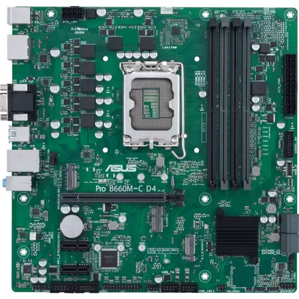 Placa de baza Asus PRO B660M-C D4-CSM LGA 1700 CPU Intel® Socket LGA1700 for 12th Gen Intel® Core™, Pentium® Gold and Celeron® Processors Intel® Socket LGA1700 for 12th Gen Intel® Core™, Pentium® Gold and Celeron® Processors Supports Intel® Turbo Boost Technology 2.0 and Intel® Turbo Boost Max Technology 3.0** * Refer to www.asus.com for CPU support list. ** Intel® Turbo Boost Max Technology 3.0 support depends on the CPU types. Chipset B660 Intel® B660 Chipset Memory 4 x DIMM, Max. 128GB, DDR4 5000(OC)/4800(OC)/4600(OC)/4400(OC)/4266 (OC)/4000(OC)/3733(OC)/3600(OC)/3466(OC)/3400(OC)/3333 (OC)/3200/3000/2933/2800/2666/2400/2133 Non-ECC, Un-buffered Memory* Dual Channel Memory Architecture Supports Intel® Extreme Memory Profile (XMP) Optimem *Actual Memory data rate support depends on the CPU types and DRAM modules, for more information refer to www.asus.com for the Memory QVL (Qualified Vendors Lists). Graphics 2 x DisplayPort** 1 x D-Sub port 1 x HDMI® port*** * Graphics specifications may vary between CPU types. Please refer to www.intel.com for any updates. ** Supports max. 4K@60Hz as specified in DisplayPort 1.4. *** Supports 4K@60Hz as specified in HDMI 2.1. Expansion Slots Intel® 12th Gen Processors 1 x PCIe 4.0/3.0 x16 slot Intel® B660 Chipset 2 x PCIe 3.0 x1 slots Storage Intel® 12th Gen Processors M.2_1 slot (Key M), type 2242/2260/2280 - Intel® 12th Gen processors support PCIe 4.0 x4 mode Intel® B660 Chipset** M.2_2 slot (Key M), type 2242/2260/2280 (supports PCIe 4.0 x4) 4 x SATA 6Gb/s ports * Intel® Rapid Storage Technology supports SATA RAID 0/1/5/10. ** Intel® Rapid Storage Technology supports Intel® Optane Memory H Series on PCH attached M.2 slots. Ethernet 1 x Intel® 1Gb Ethernet 1 x Intel® 1Gb Ethernet ASUS LANGuard Wireless & Bluetooth M.2 slot only (Key E, CNVi & PCIe)* https://www.asus.com/Motherboards-Components/Motherboards/CSM/Pro-B660M- C-D4-CSM/techspec/
